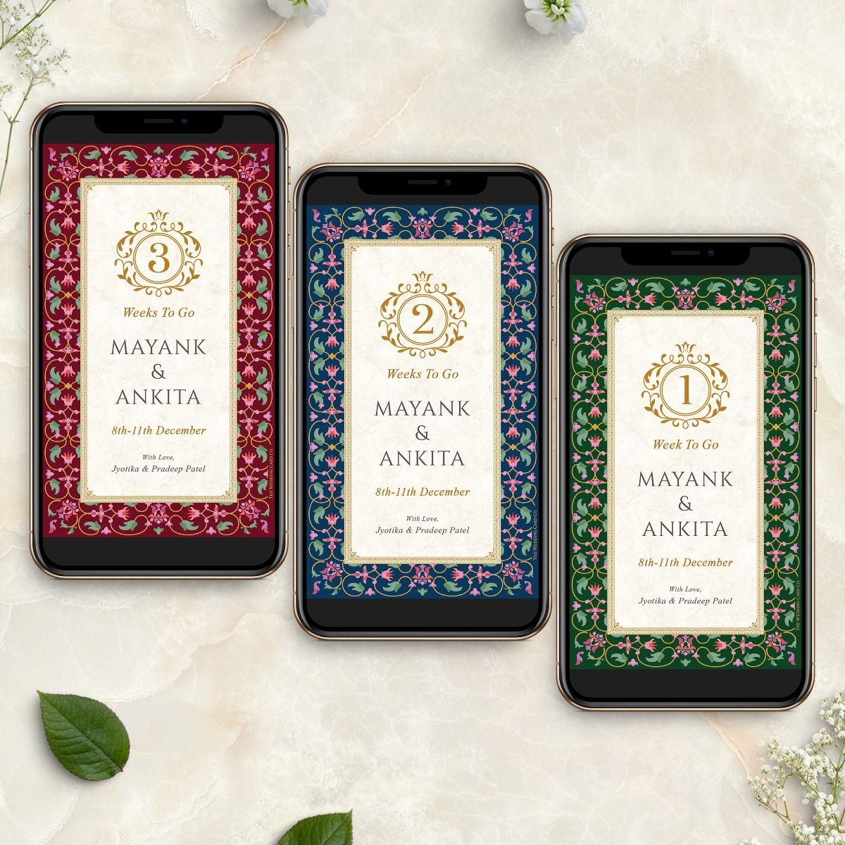 This is our ‘Crimson Garden – Ornate’ Floral wedding invitation card. It is adorned with bright crimson, red and pink hued florals and a pink and gold frame (available in various hues and different floral placements). The top of this card is adorned with a Ganeshji motif (interchangeable). The envelope has similar floral designs on the front and gold highlights on the flap. This is perfect for brides and grooms who love floral wedding invitations.